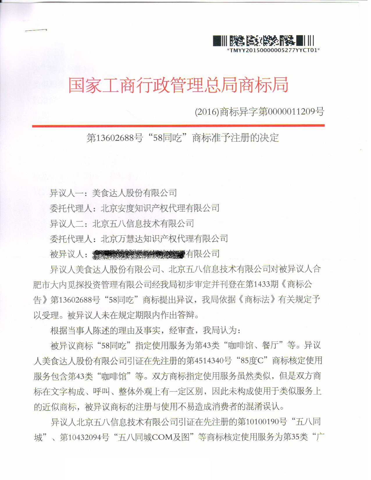 "58同吃”商标准予注册的决定