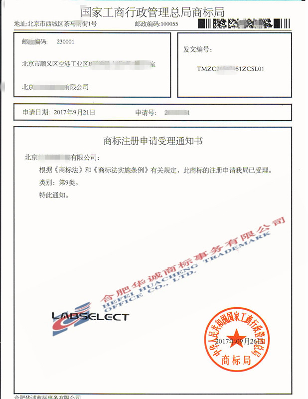 您委托我所代理商标注册申请,名称为“LABSELECT”9类商标已被国家商标局受理。