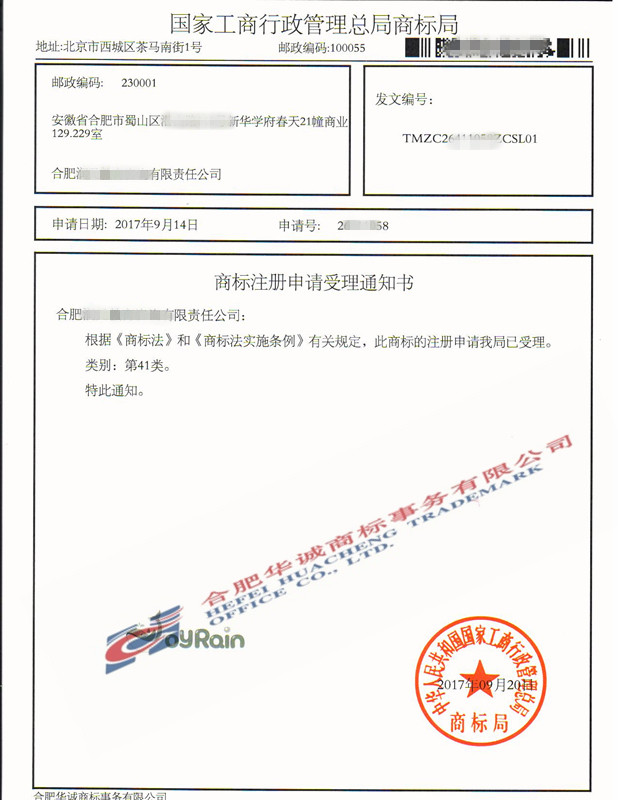 您委托我所代理商标注册申请,名称为“oyRain”41类商标已被国家商标局受理。