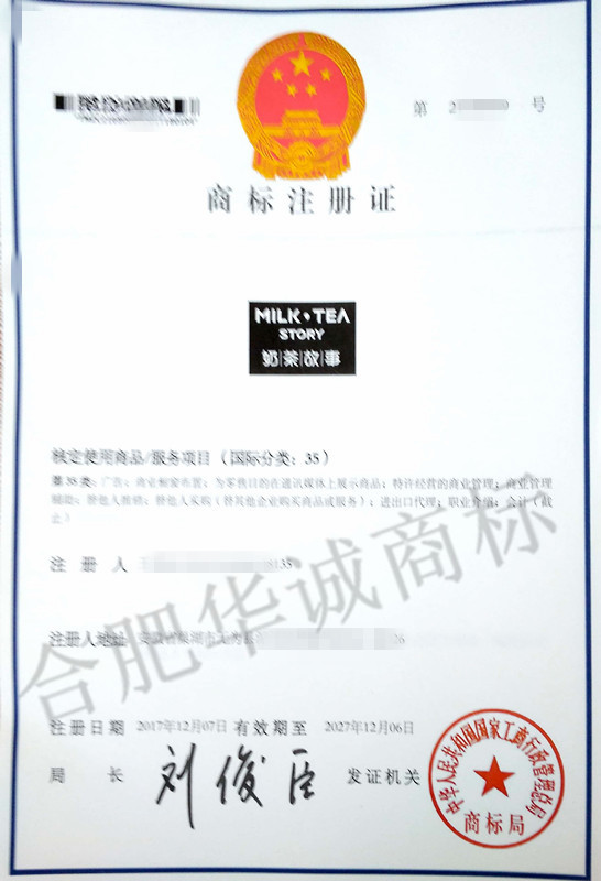 “奶茶故事”35类商标注册证下达