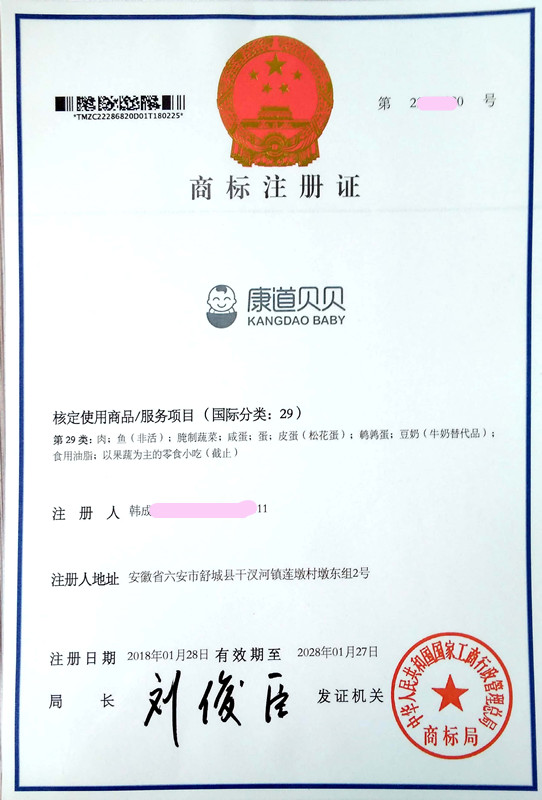 您委托我所代理商标注册申请,名称为“康道贝贝”29类商标注册证已下达。