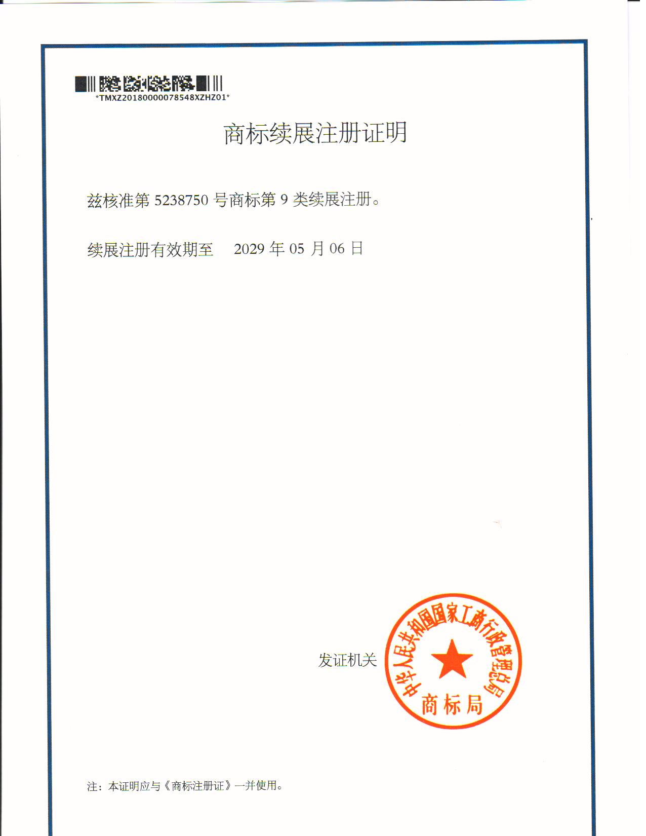 第“5238750”9类商标续展注册证明下达